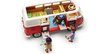 The play set contains two PLAYMOBIL figures, a Volkswagen T1 camping bus with a removable roof and suitcases, detailed interior with a folding dining table, foldable rear bench, side doors that can be opened with a mirror and space for groceries and many other lovely extras.
