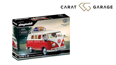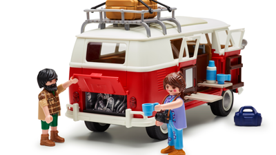 It has been an icon on the road for decades: the Volkswagen T1 Camping Bus. Loved by generations, countless adventurous people have traveled the world with him. The classic among camping buses also has many iconic details in the PLAYMOBIL version, such as the iconographic front section in V-shape with red and white color separation and red VW logo, rounded roof, split windshield and removable roof rack. When the roof section is opened, the authentically designed interior becomes visible. True to style, the interior of the T1 offers a folding table with two seats and a sink with a refrigerator. The bench with a typical 1960s plaid pattern can be converted into a bed for two people. The side doors can also be opened; a shelf for groceries is integrated in them and a hinged shelf and a mirror are integrated in the other door. The Volkswagen T1 Camping Bus: get in, drive off and enjoy the freedom!