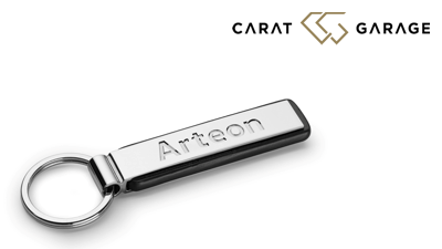 Hochwertiger Metallschlüsselanhänger in Kombination mit PU-Leder. Der Artikel trägt den Schriftzug Arteon als Gravur.